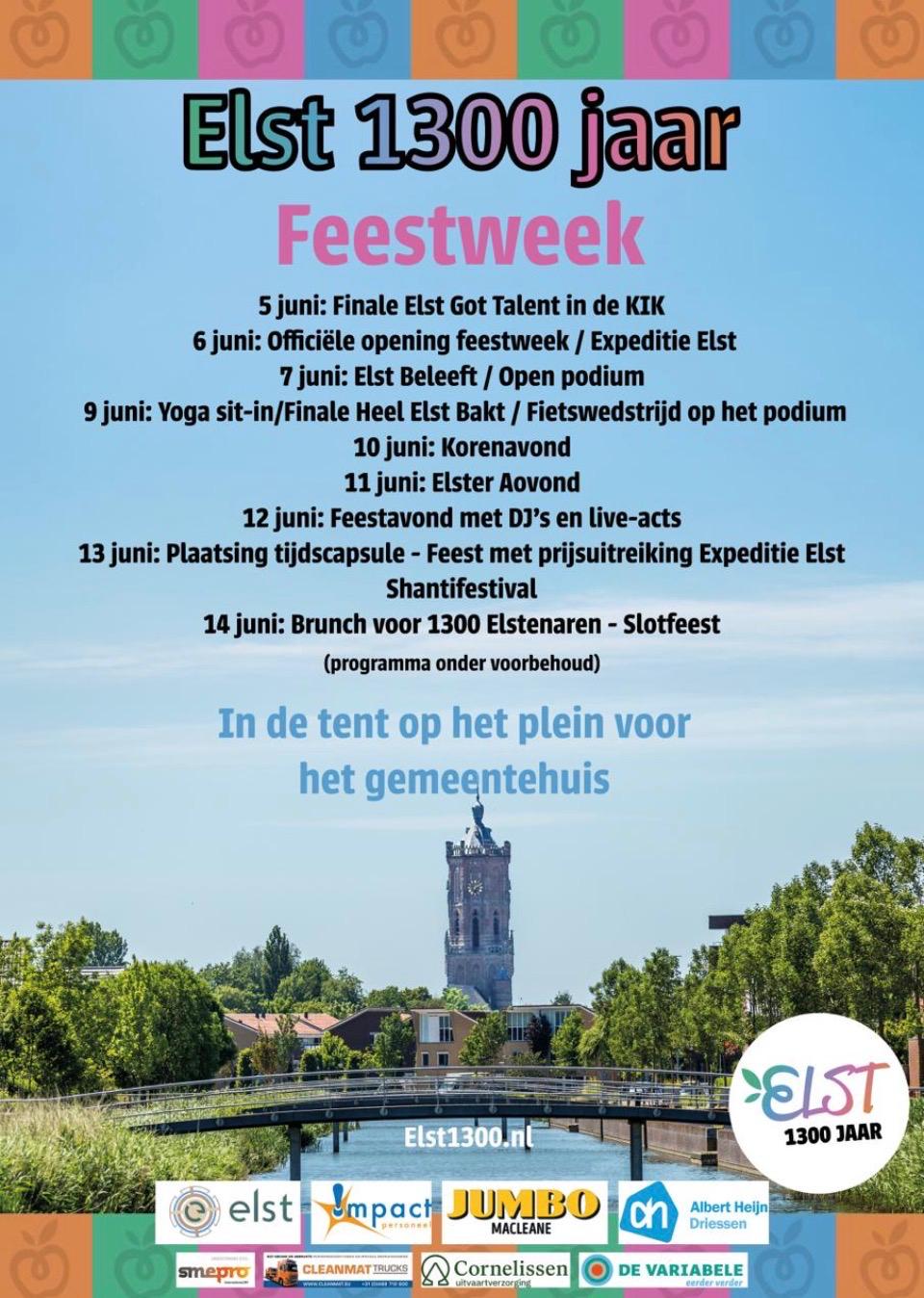 Om dit historische moment groots te vieren, is de stichting Elst 1300 opgericht. Een enthousiaste groep vrijwilligers, bestaande uit Elstenaren, werkt keihard om er een onvergetelijk jaar van te maken.